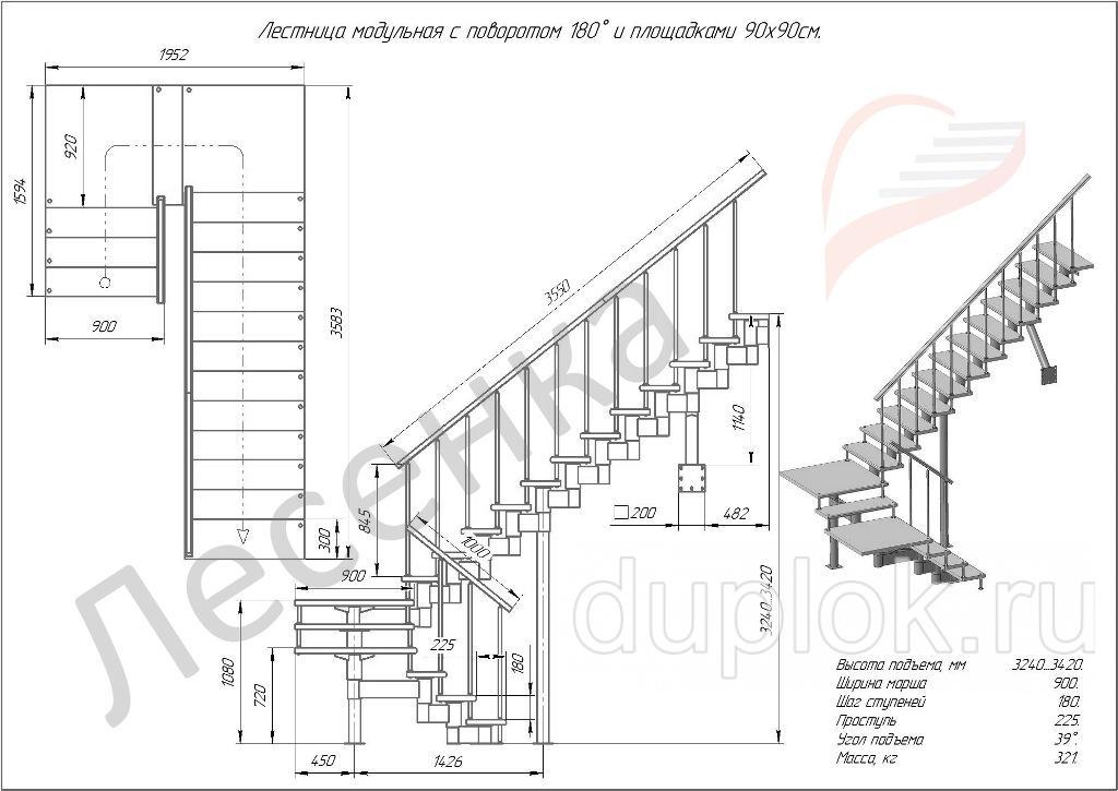 Модульная лестница Комфорт поворот на 180гр. h=3240-3420мм