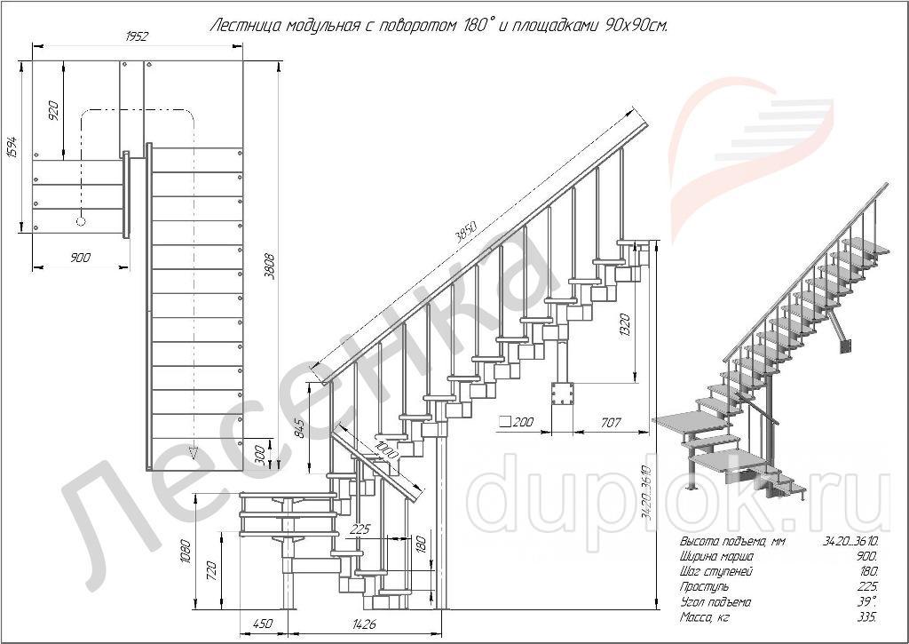 Модульная лестница Комфорт поворот на 180гр. h=3420-3610мм